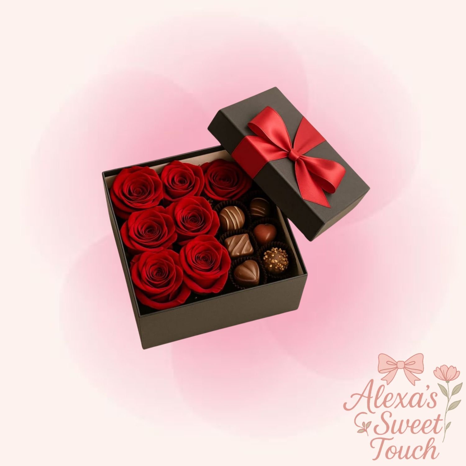 Caja elegante con rosas frescas y chocolates gourmet, una combinación perfecta de dulzura y romance.