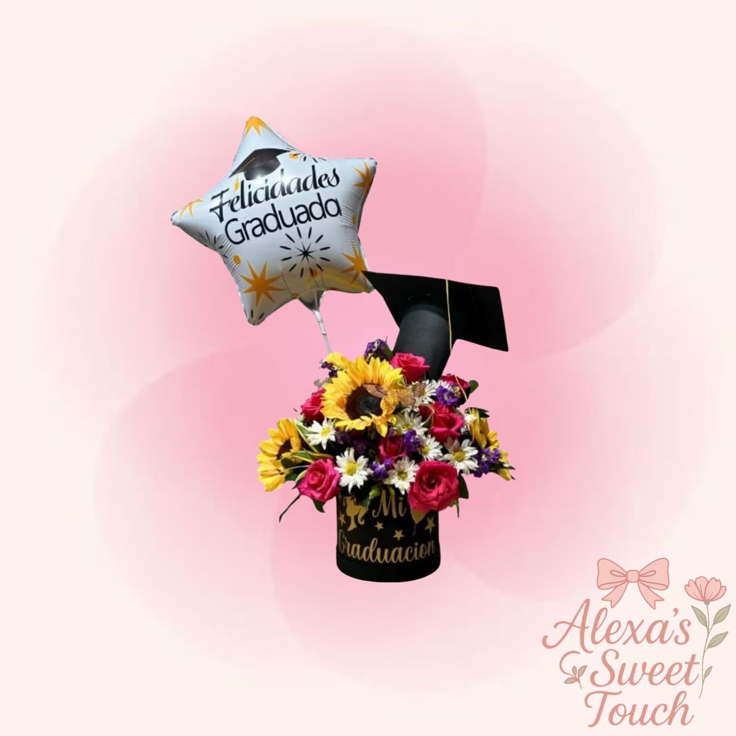 Incluye una figura de graduado, globo con frase y rosas lindas.